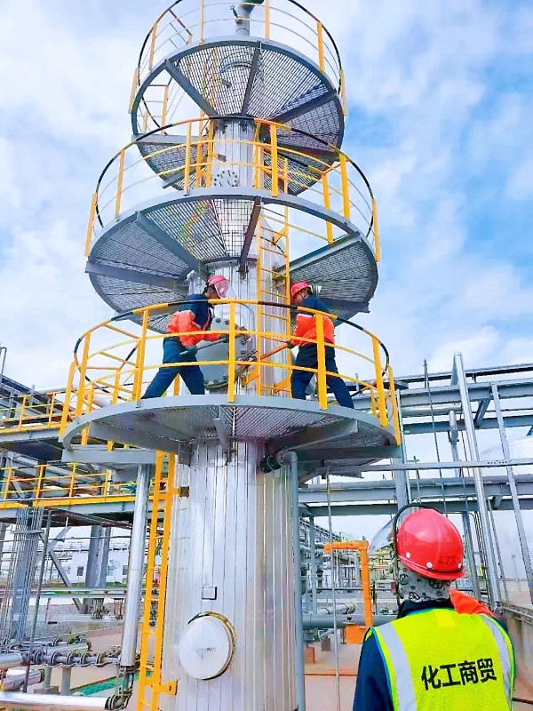 “高处作业的防范措施有哪些?碱液卸车前准备要做到哪些?监护人员的责任是否熟知……”10月4日,在化工园区物流园货场各个施工现场,石化集团化工商贸公司值班领导及技术人员来到施工现场,进行例行巡检。