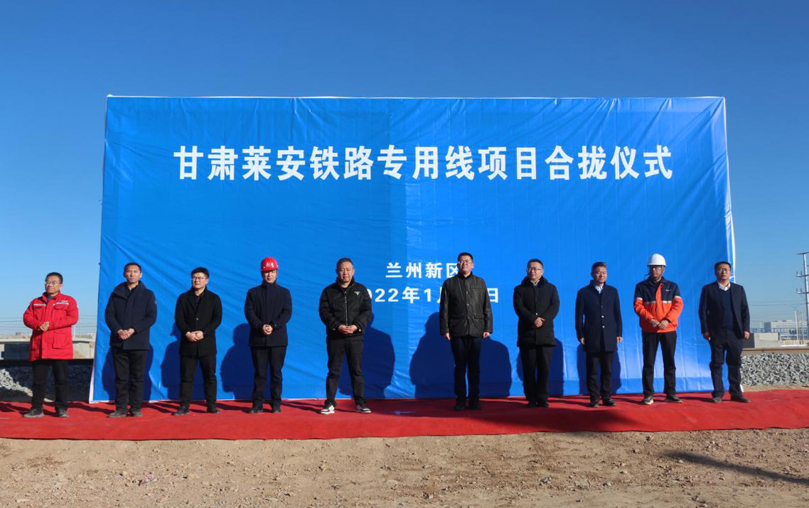 2022年1月19日上午10时,在化工物流园货场举行甘肃莱安铁路专用线项目合拢仪式。兰州新区石化集团总经理姜锦、兰州新区商投集团总经理王坚民及中铁二十一局、甘肃莱安能源有限公司领导出席仪式。
