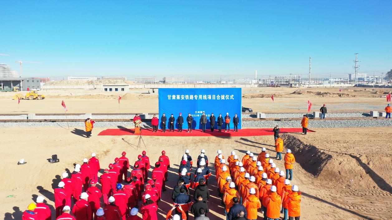 2022年1月19日上午10时,在化工物流园货场举行甘肃莱安铁路专用线项目合拢仪式。兰州新区石化集团总经理姜锦、兰州新区商投集团总经理王坚民及中铁二十一局、甘肃莱安能源有限公司领导出席仪式。