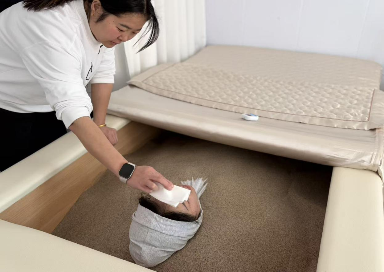 下午,活动迎来重头戏——沙疗主题养生体验。全体女职工前往专业沙疗养生馆,沉浸式感受源自维吾尔的沙疗文化。沙疗,又称埋沙疗法,是依托西北独特地理气候条件形成的传统养生技艺,通过温热的天然矿沙覆盖身体,利用沙粒的机械压力与远红外效应,深层驱散体内湿寒,舒缓肌肉疲劳,改善血液循环。